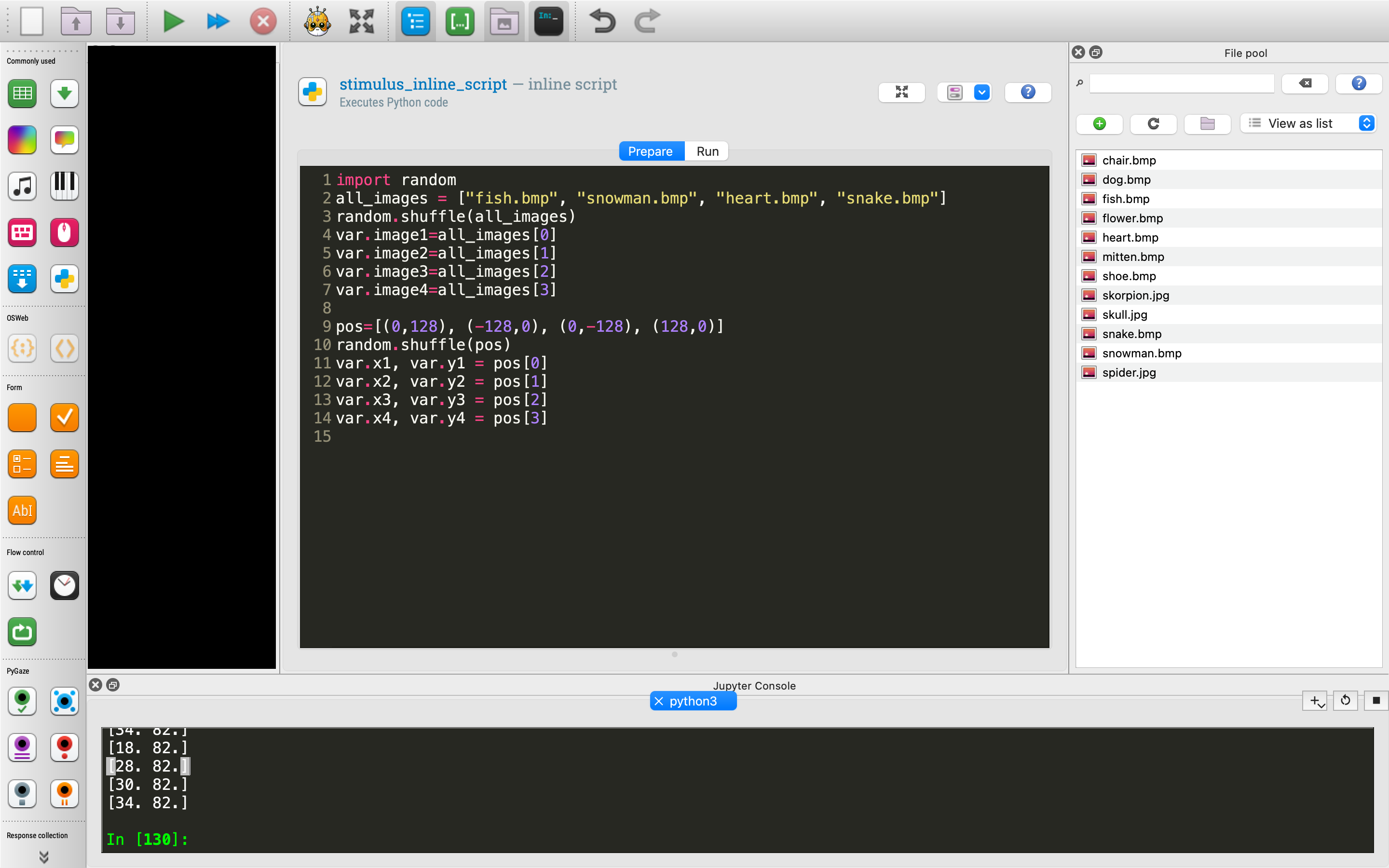 First, I want to create a sketchpad that displays a circular array of 8 images all at once, but they need to be randomly drawn from a selection of 12 images. I have created an inline script with this code: