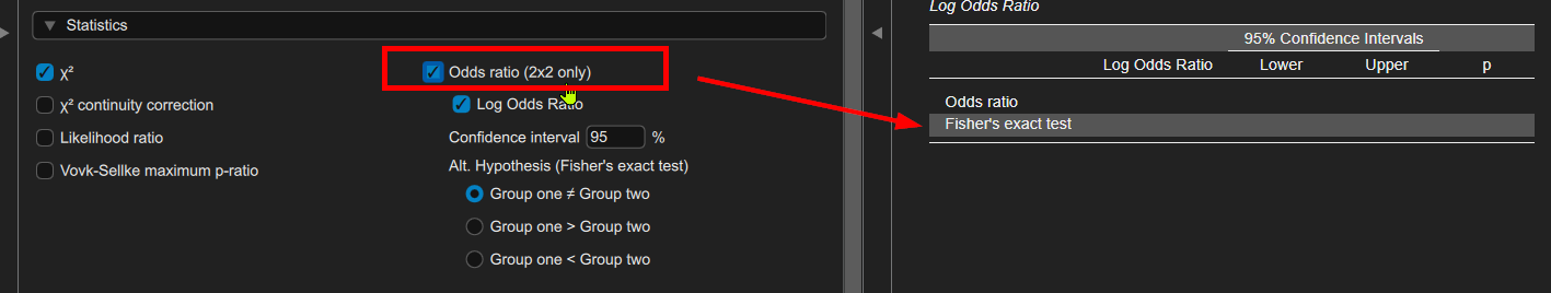 I am working with categorical data in JASP and need to run Fisher’s Exact Test. However, I cannot find an option explicitly labeled “Fisher’s Exact Test” in the interface. I only see options such as Chi-square test and Continuity correction, but I am not sure whether Fisher’s test is available under a different name or menu.