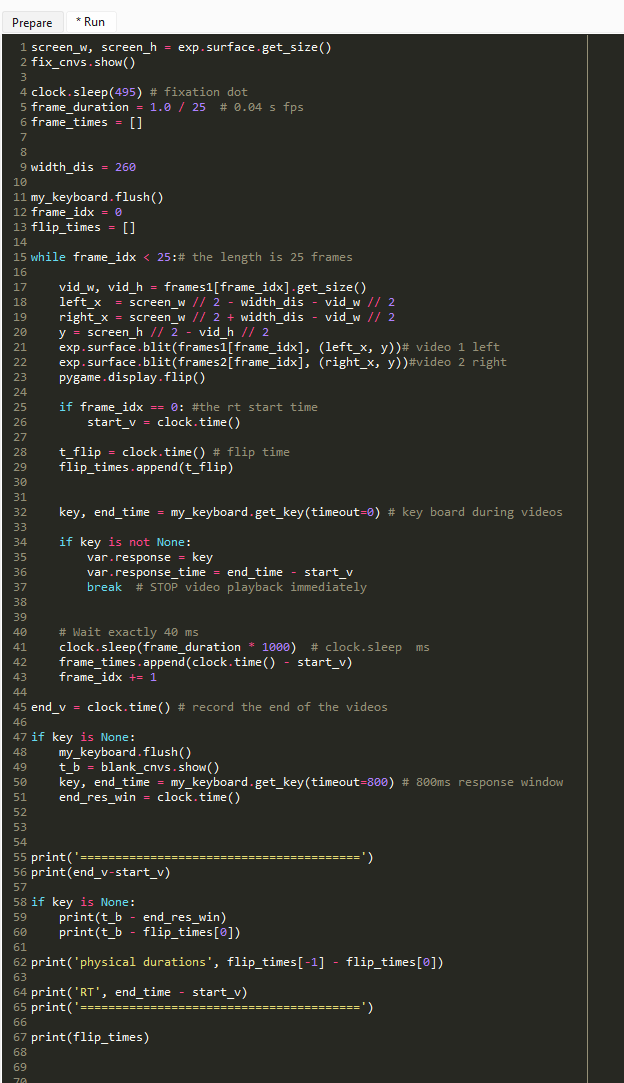 The experiment appears to run as intended at the behavioral level. However, because the video is presented at 25 FPS on a 60 Hz display, I would like to confirm whether my implementation is correct and whether the resulting stimulus timing is sufficiently precise, especially if I later extend this paradigm to an EEG experiment.