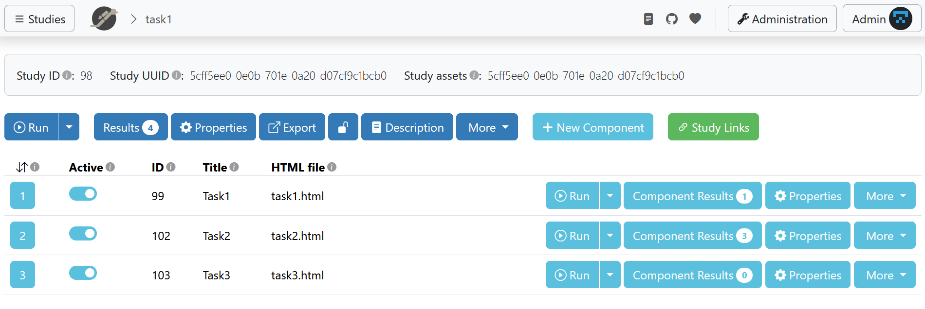 I created the tasks in Opensesame and exported them as separate JZIP file. From the JATOS local GUI, I imported the studies separately to create three different studies, each with one component.