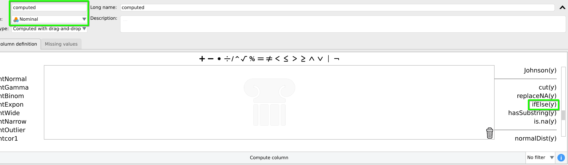 Next, give the column a name, type "Nominal" and use "drag-and-drop" to define it. The key function we need to find on the right hand side (you can scroll there) is "ifElse(y)".