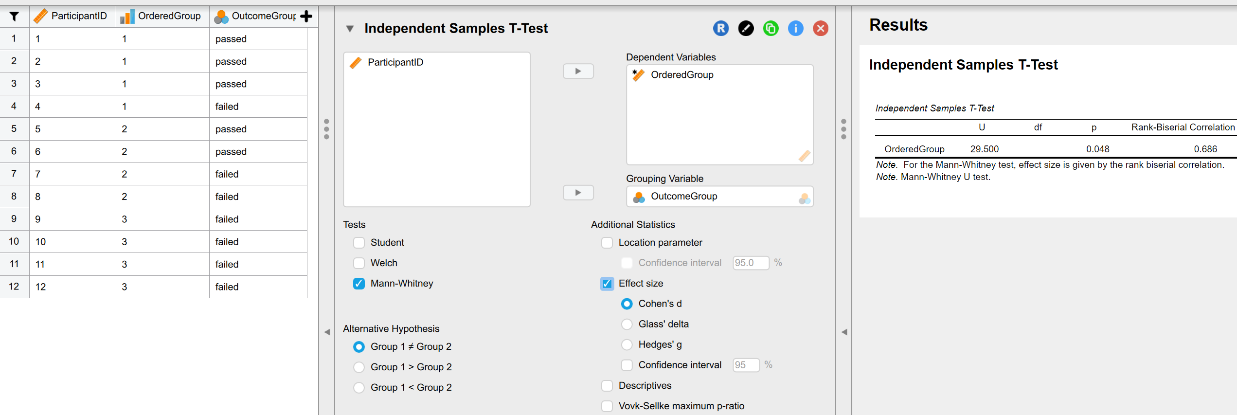 I wonder if an adequate substitute would be a rank biserial correlation https://onlinelibrary.wiley.com/doi/10.1002/ejsp.2420020412 , which quantifies the relationship between an ordinal variable and a dichotomous variable. JASP calculates the rank biserial correlation as an effect size for the Mann-Whitney U test (within the independent samples t test analysis).