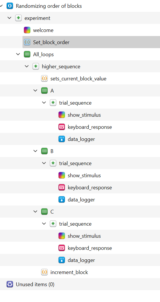 Now we have everythgin ready. If the order picked for a subject is C-B-A, the value of the curent_block the first time (out of 3 cycles) that the higher_sequence runs will be C, then when it runs a second time it will be B, and on the third and last run it will be A.