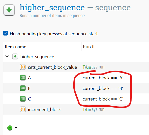 The "run if" conditions ensure that although we reapet the higher_sequence 3 times, only one block will be run each time.