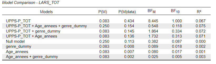I'd like to predict scores from variable LARS_TOT using variables UPPS-P_TOT, Age_annees, and genre as predictors. Variable genre is the only categorical variable.
